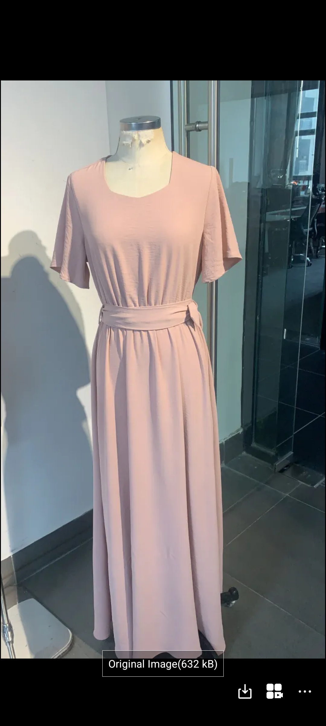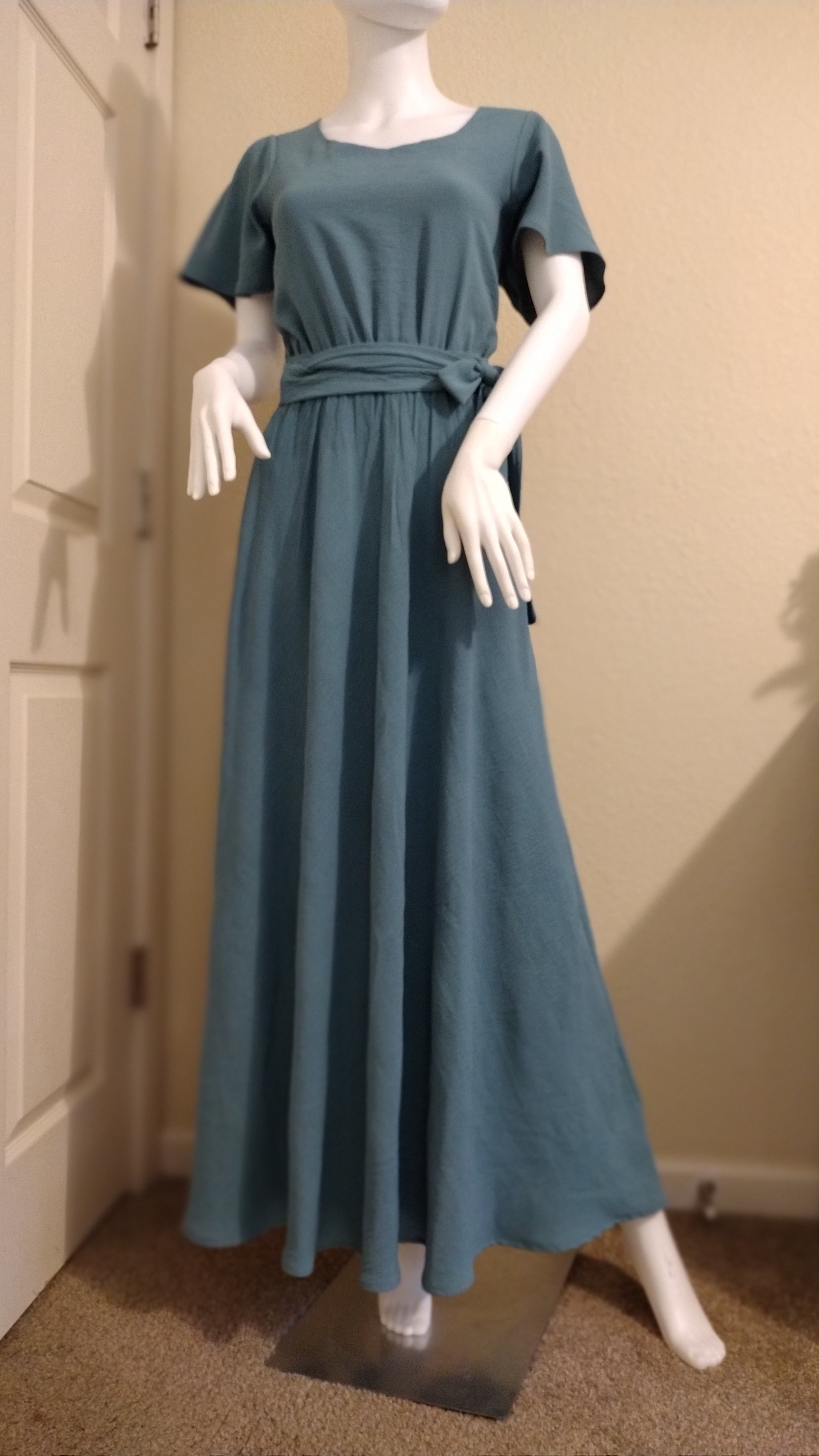 Front and back double fabric. A-line skirt. Flowy short sleeves. Elastic waist.