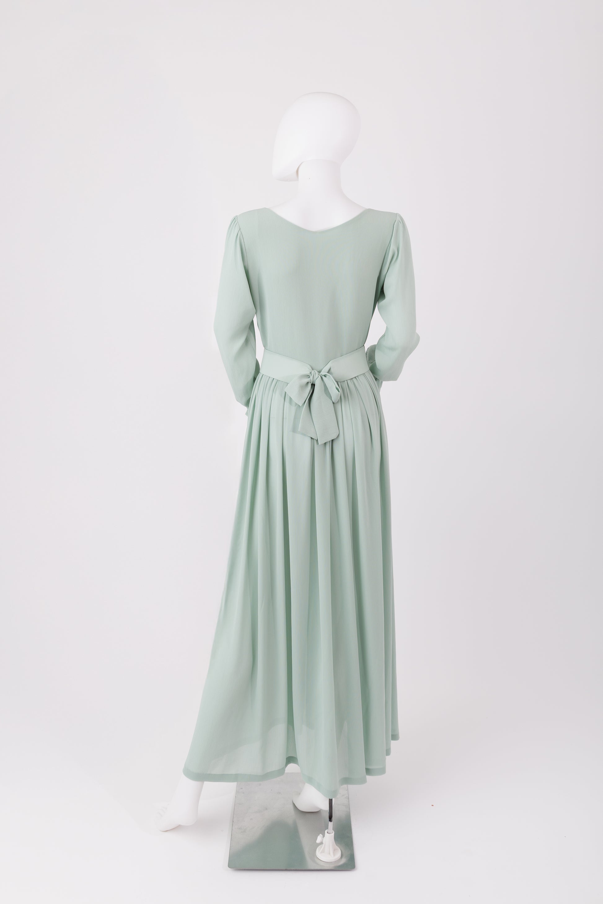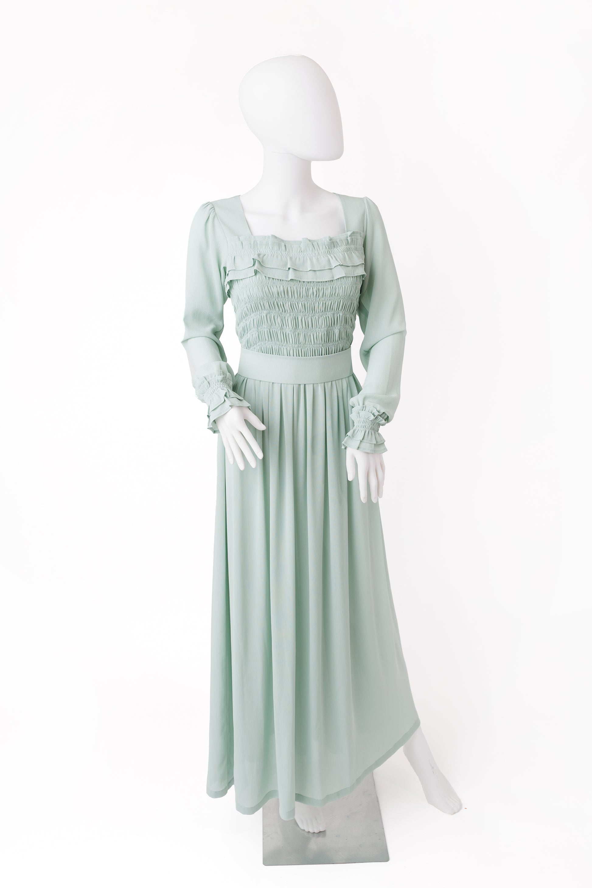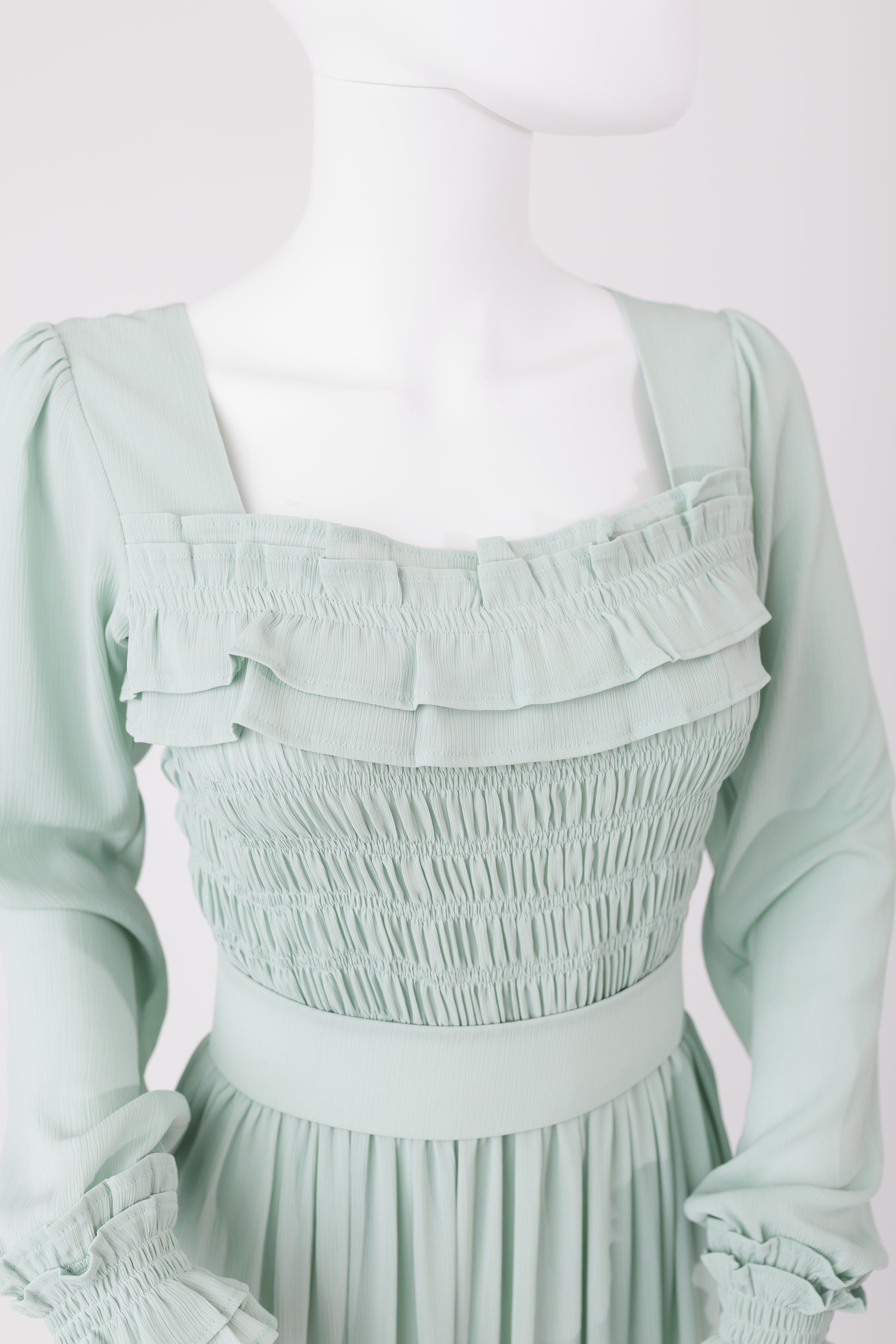 An elegant long-sleeved dress with an elastically gathered front is enhanced with double ruffles.