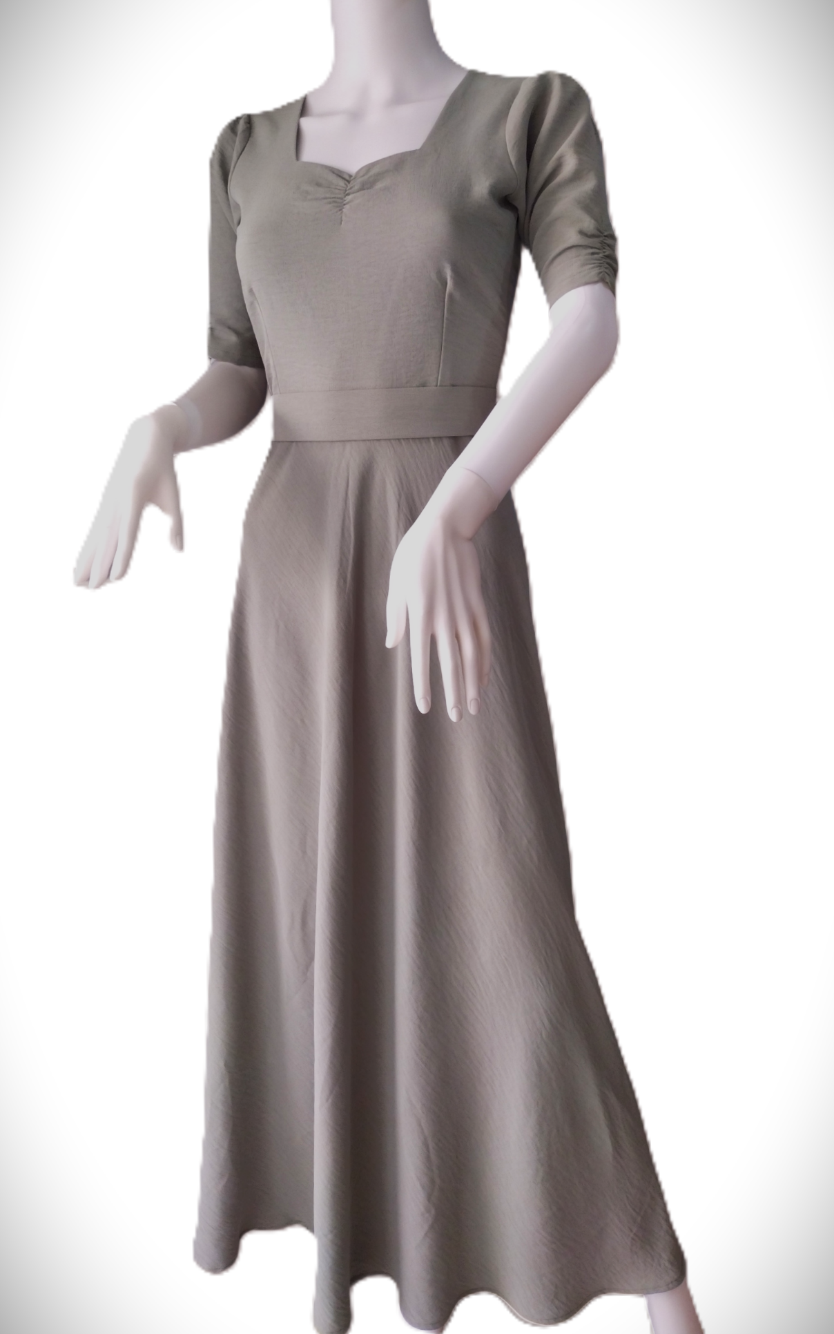 sweetheart drees with elastic scrunched front and 13 inches long sleeves with elastic scrunched, round skirt 2 inches belt tie in the back .