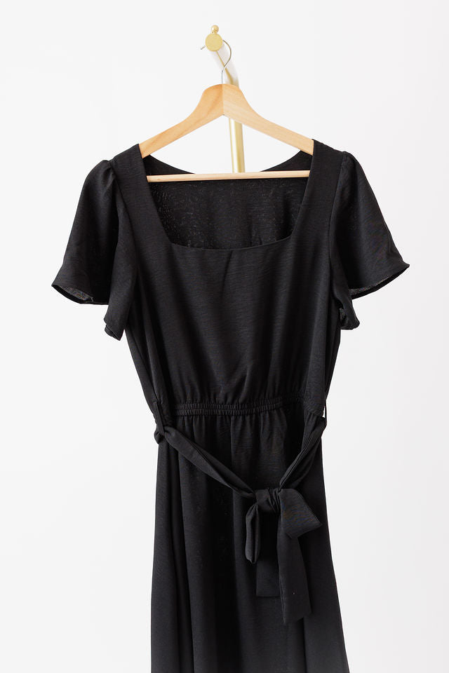 Effortlessly stylish and flattering, this dress is your new go-to for warm days or casual evenings out. Featuring a modern square neckline and short flowy sleeves, it strikes the perfect balance between comfort and sophistication. The elasticized waist provides a tailored fit, while the matching fabric tie belt cinches the waist to accentuate your silhouette.
